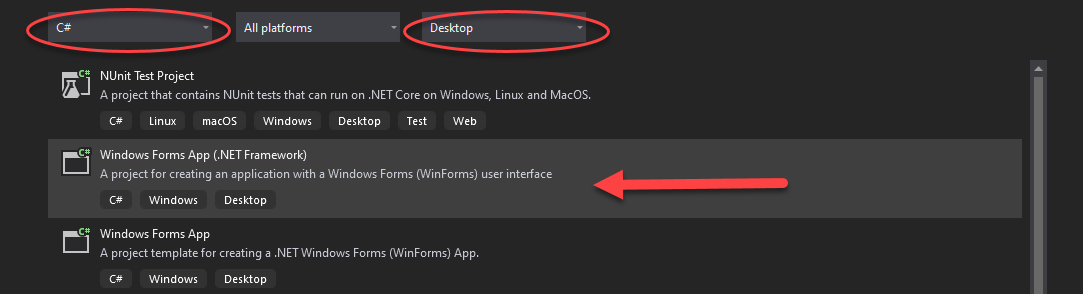 - Near the top should be “Windows Forms App (.NET Framework)”