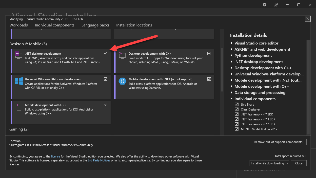 - Under Desktop and Mobile options, you will see .NET desktop environment, select this option