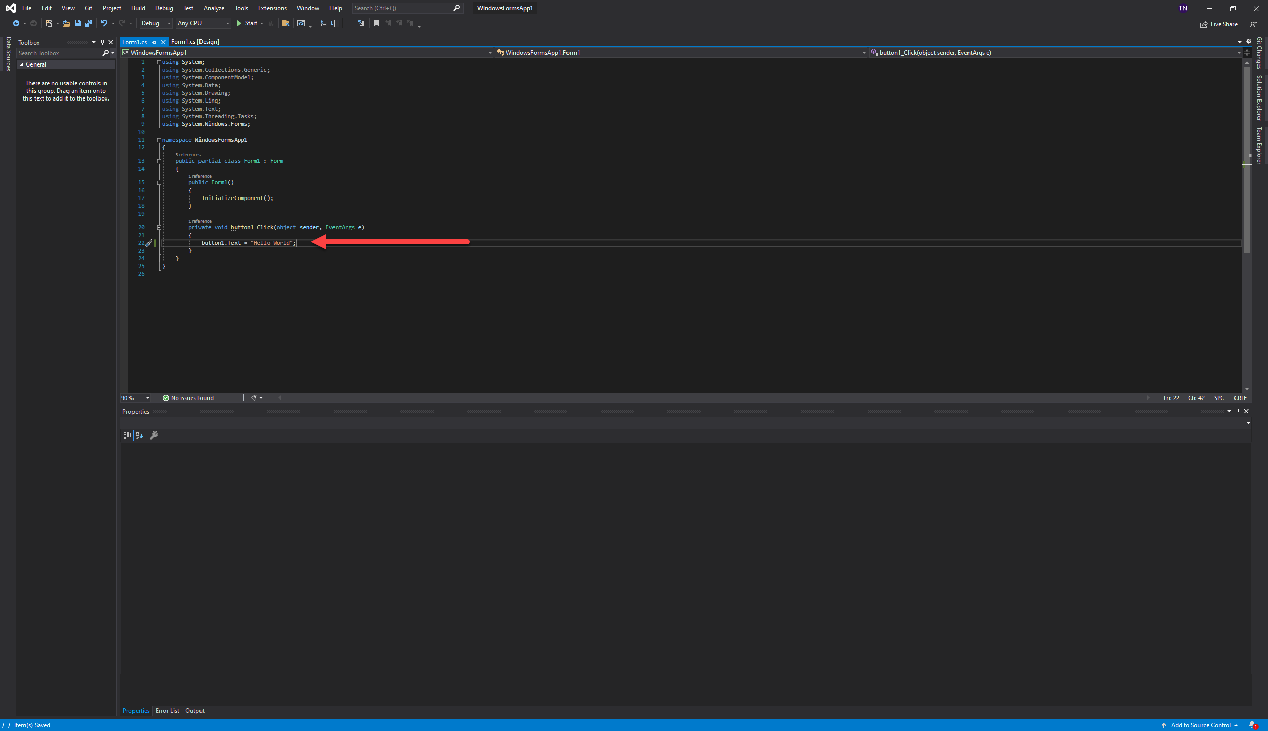 - In form1.cs, you will now see button1_Click(), add the following line: button1.Text = “Hello World”;